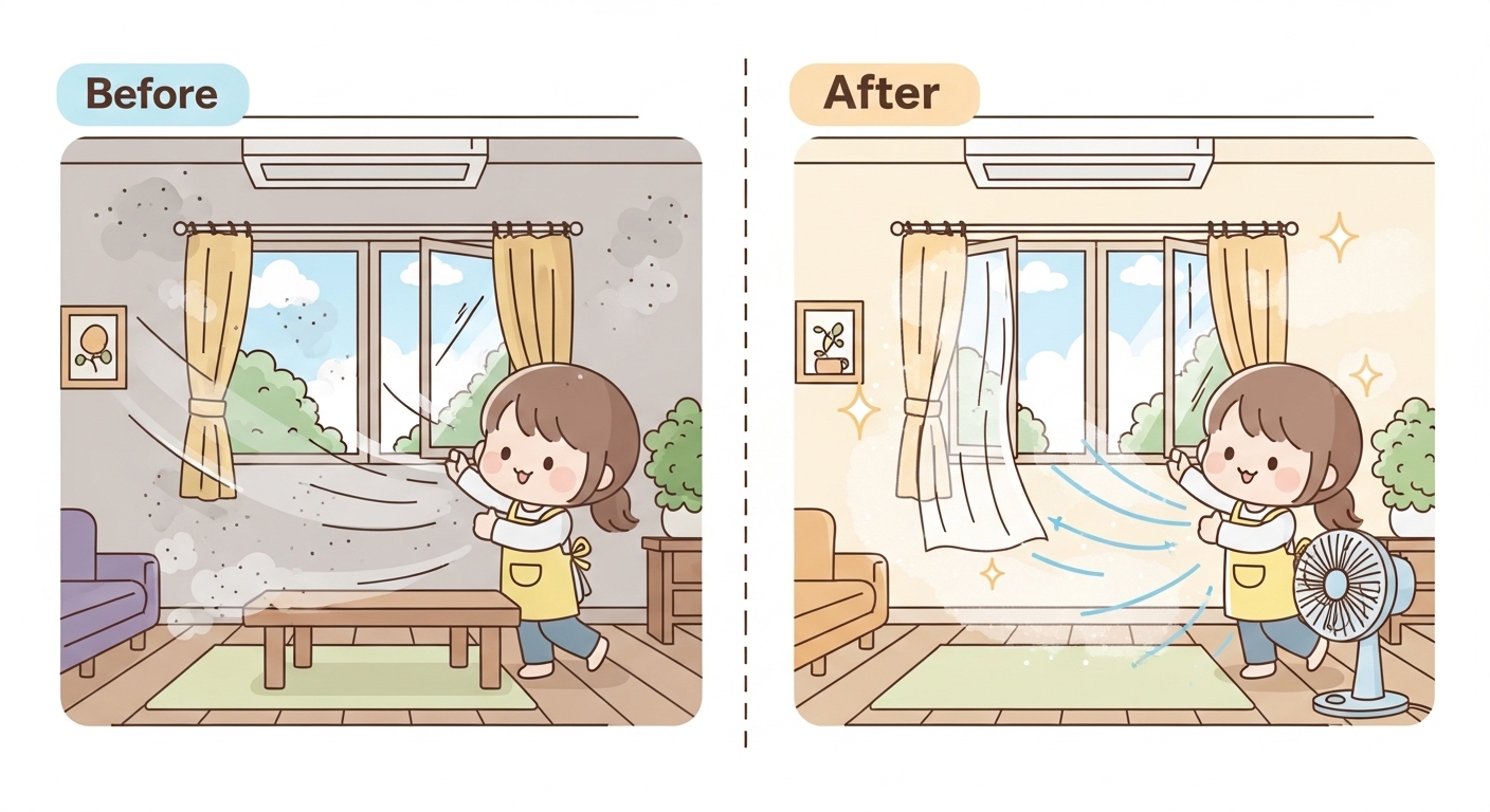 제가 이 방법을 제대로 시도하기 시작하면서 확실히 달랐습니다. 창문 하나 열었을 때는 30분을 환기해도 공기가 크게 변하지 않았는데, 반대쪽 창문이나 현관문까지 같이 열었더니 5~10분 만에 공기가 눈에 띄게 가벼워지는 걸 느꼈습니다. 특히 선풍기를 창문 안쪽에 두고 바깥을 향해 돌리면 강제로 오염 공기를 밀어내는 강제 환기 효과가 생겨서 훨씬 빠르게 실내 공기가 교체됐습니다.